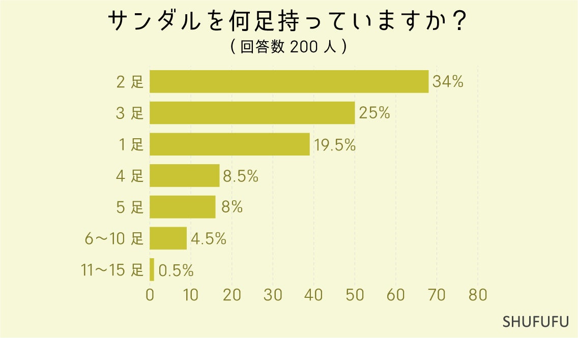 サンダルを何足持っているかでは「2足」と答える方が1番多かったです。2、3足持っている方を合わせると半数以上になりました。