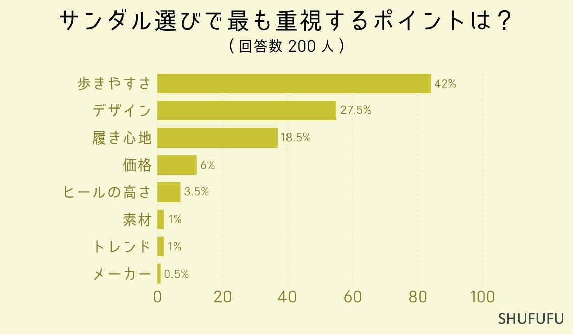 サンダル選びで最も重視するポイントを尋ねたところ、1位は「歩きやすさ(42%)」、2位「デザイン(27.5%)」となりました。靴擦れや歩きにくさといったトラブルを経験した方が多かったので、「歩きやすさ」を重視する人が多いようです。