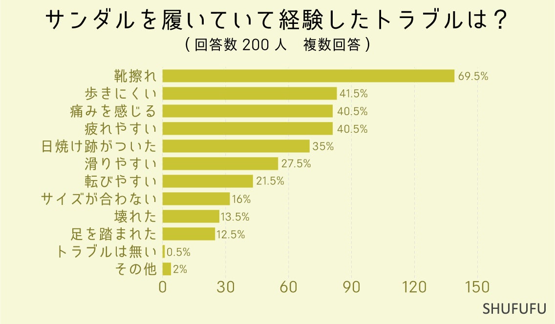 サンダルを履いていて経験したトラブルに関しては1位「靴擦れ(69.5%)」、2位「歩きにくい(41.5%)」でした。サンダルは硬い素材だったり、ヒールがあるために靴擦れすることがありますね。トラブルに遭遇したことがない方は「0.5%」となり、ほとんどの方がサンダルを履く際に何らかのトラブルに遭遇したことがあるようです。