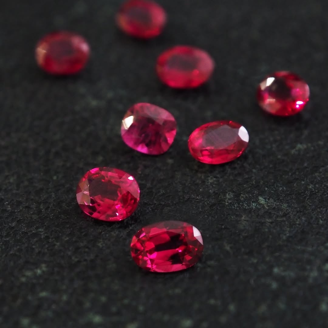 深く燃えるような赤から、軽やかでフレッシュなホットピンクまで、色味・カット・サイズの異なるさまざまなルビーをご用意いたしました。中には、放射状の星が浮かび上がる希少なスタールビーも並びます。