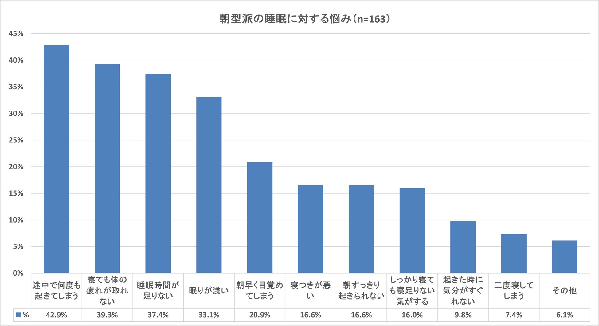睡眠に満足していない朝型派に対して悩みを聞いたところ、「途中で何度も起きてしまう(42.9%)」「寝ても体の疲れが取れない(39.3%)」「睡眠時間が足りない(37.4%)」「眠りが浅い(33.1%)」が上位になりました。睡眠の量よりも質に関する悩みが多い傾向です。