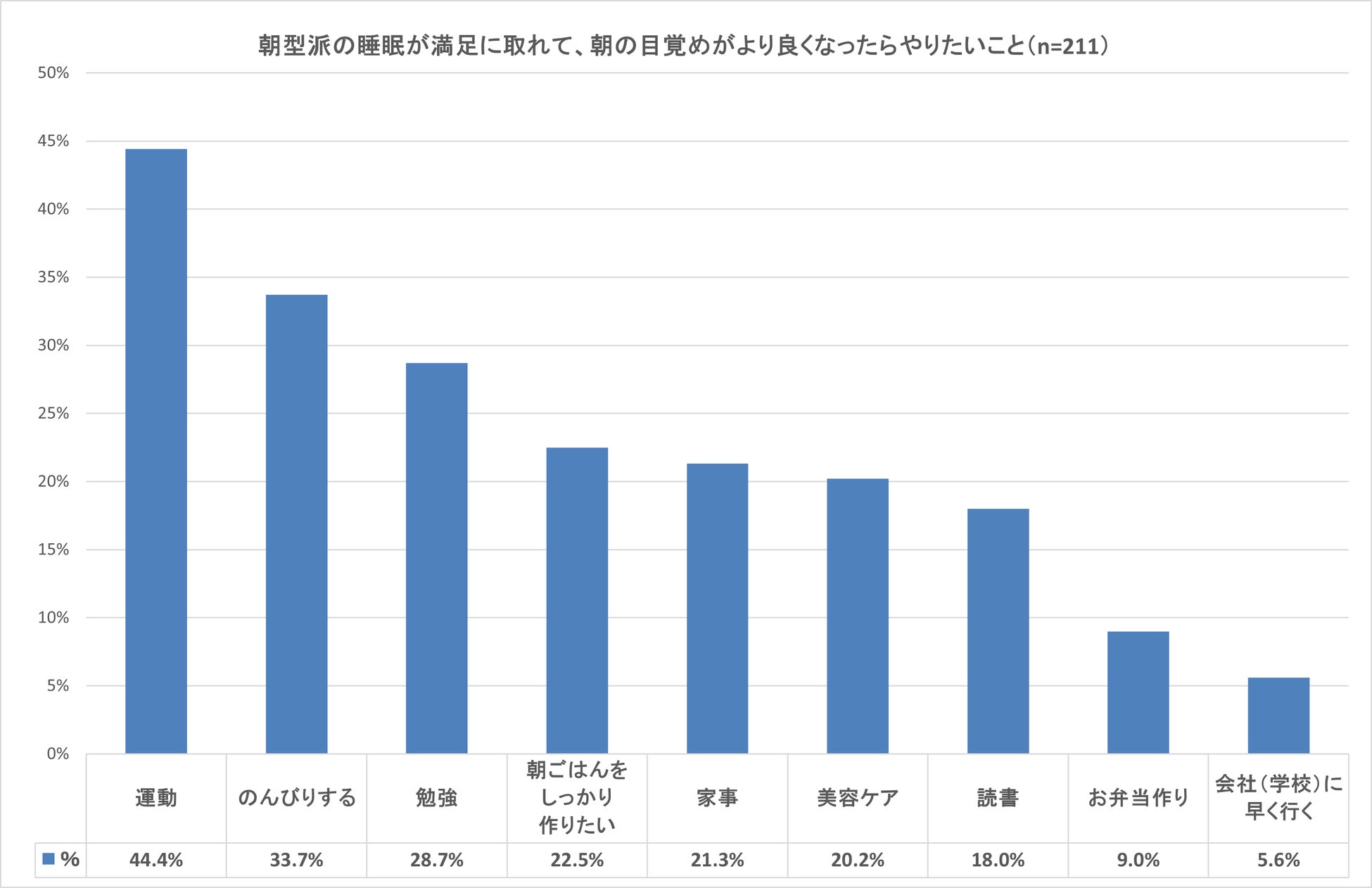 今後、睡眠が満足に取れて、目覚めが良くなったらやりたいこととして、「運動(44.4%)」「のんびりしたい(33.7%)」「勉強「28.7%」が上位となりました。朝の習慣として取り入れやすい運動や勉強、家事だけではなく、リラックスして気持ちの良い一日をスタートさせたいという意識もうかがえます。