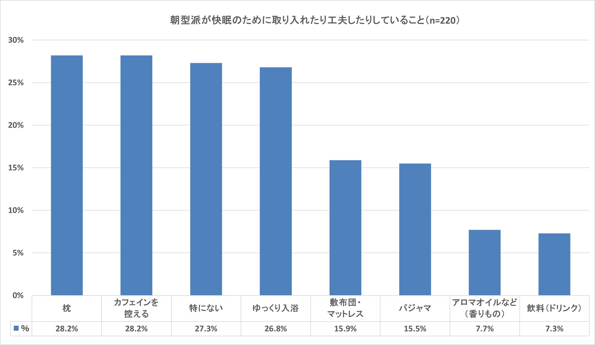 朝型派も7割は睡眠に「不満」、快眠のために「枕やマットレス、パジャマ」など取り入れやすい日用品が人気の傾向<朝時間.jp調査>