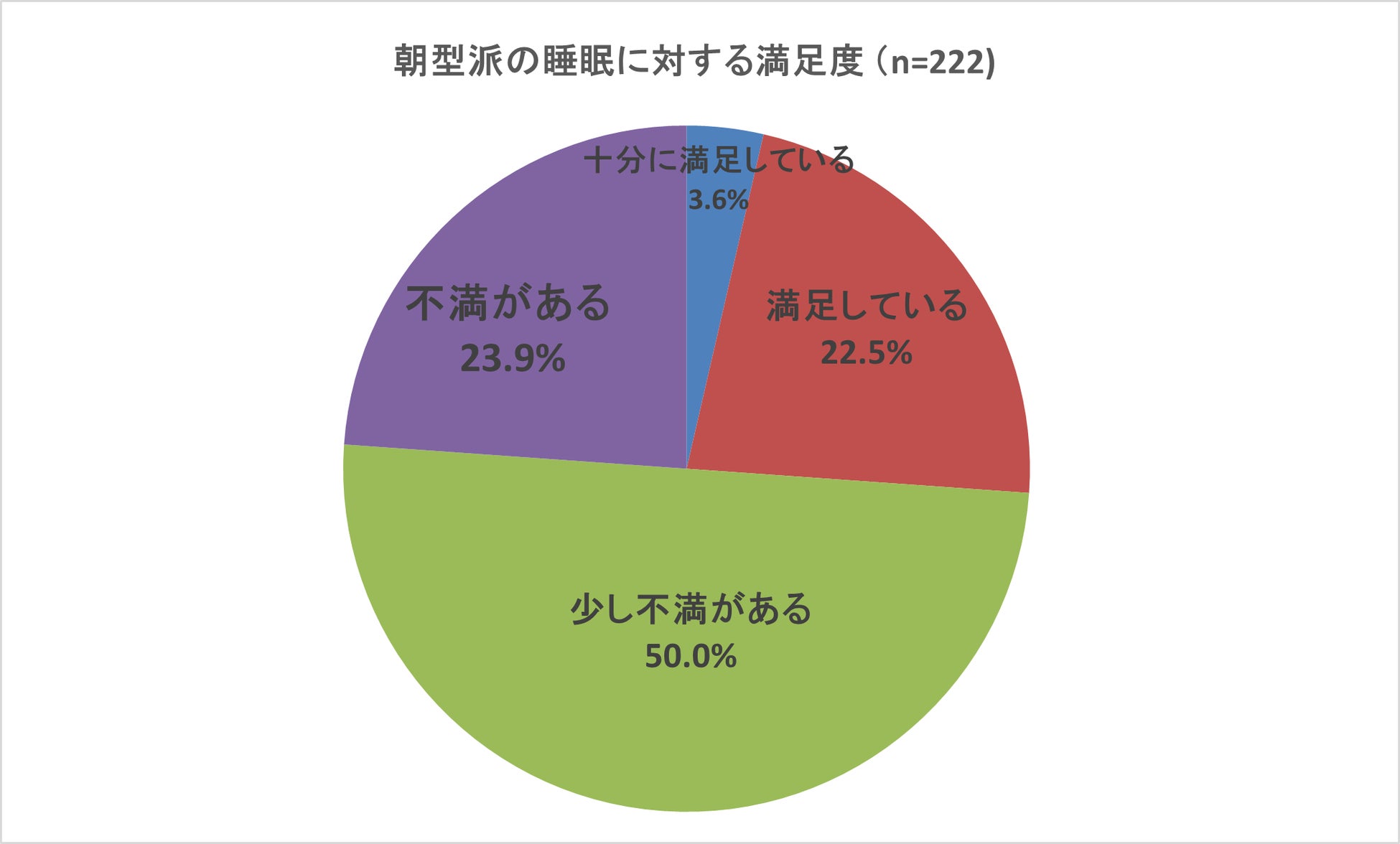 睡眠に対する満足度について、約3割が「満足している(十分に満足している・満足している 合算値)」、約7割が「不満がある(少し不満がある・不満がある 合算値)」となっており、多くの朝型派が睡眠に対して不満を抱えています。