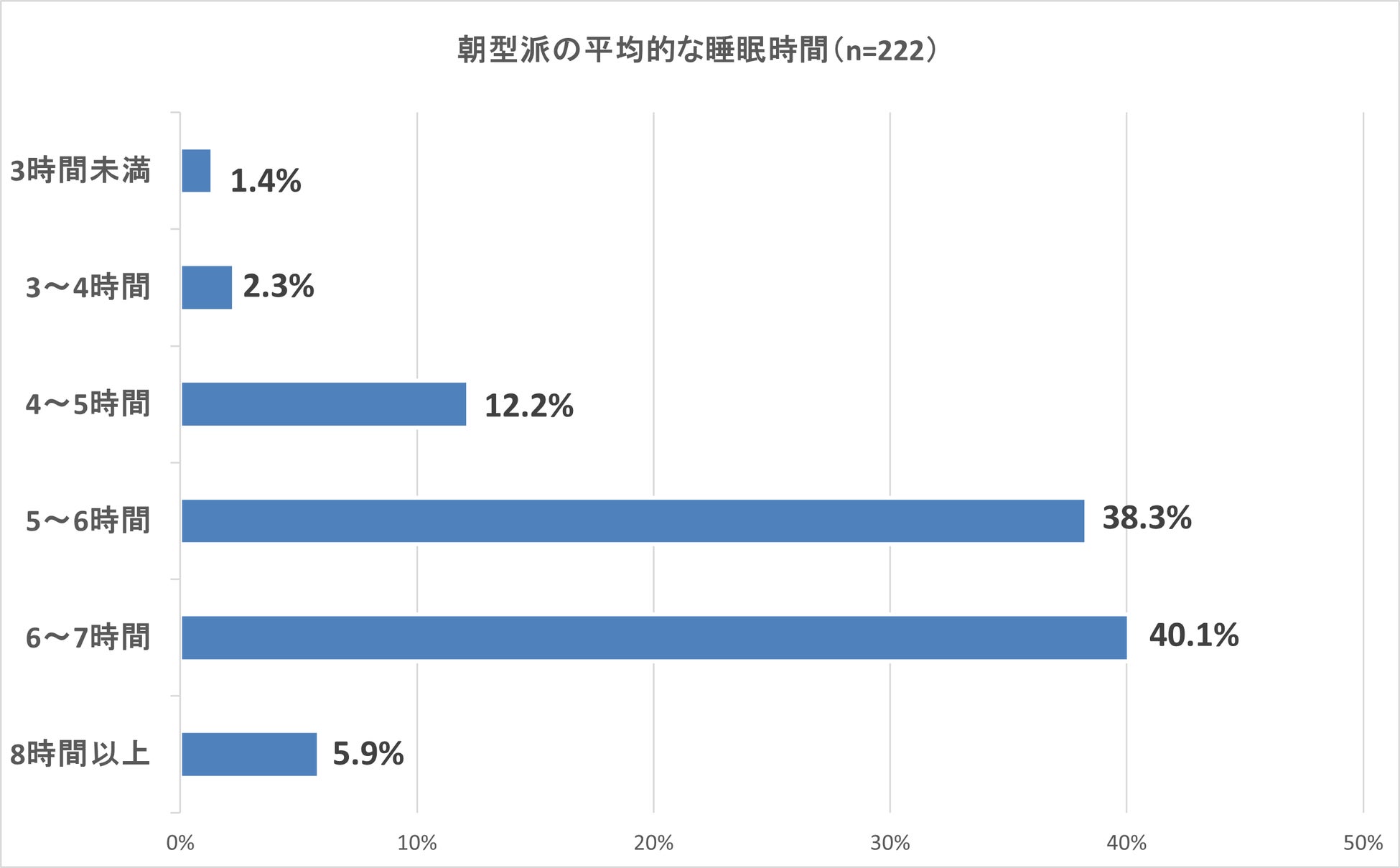 朝型派の平均的な睡眠時間は5~6時間、6~7時間がいずれも40%前後になっています。短時間睡眠ではなく、しっかりと睡眠を取る傾向です。