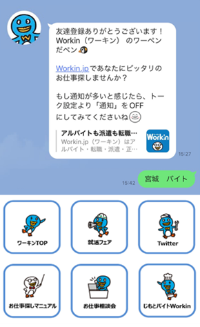 「Workin.jp」の会員機能をLINE公式アカウントへ移行し、新しい求職者との接点を構築。求職者が住むエリアの求人情報、東北・北陸エリアの就活イベントの情報、キャンペーン情報などの配信を定期的に行います。