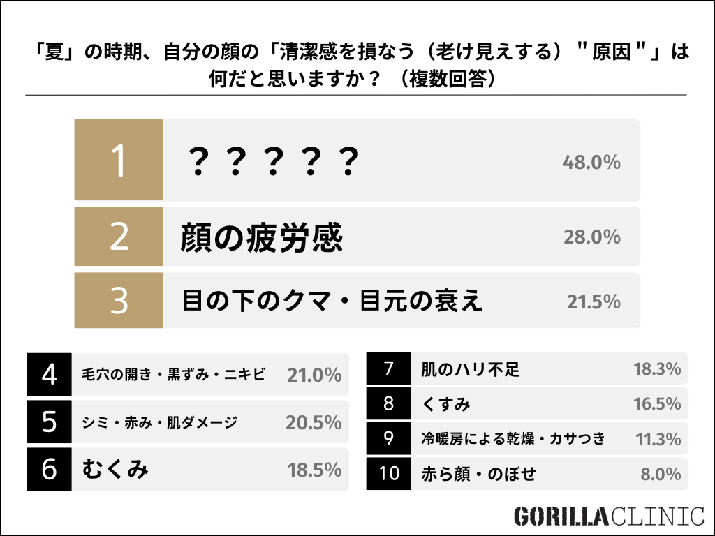 そこで全国23院展開する男性専門の総合美容医療「ゴリラクリニック」(医療法人社団十二会/東京都新宿区、稲見文彦総院長)では、20~59歳の男性400名(各世代100名)を対象に、2026年3月9日の1日間、【男性世代別/夏時期の外見・内面のコンディション】についてアンケートを実施(インターネット調査)。