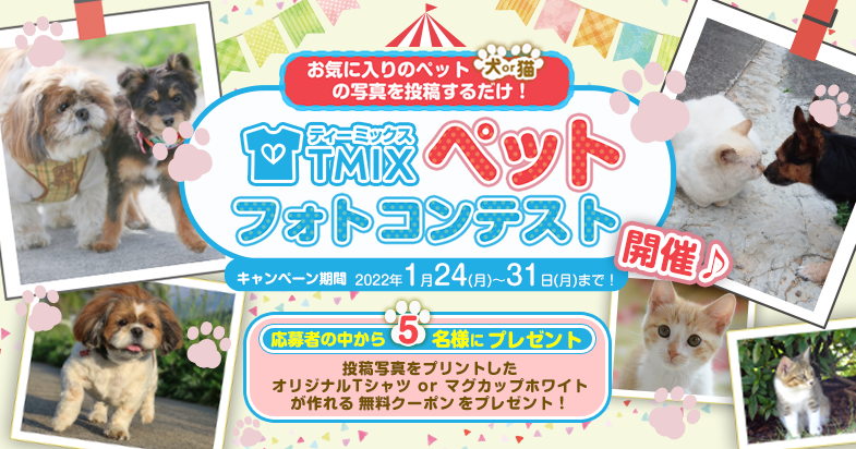 ペット(犬or猫)フォトコンテスト開催!写真をプリントしたオリジナルTシャツ・マグカップどちらか1つが無料で作れるクーポンを5名様にプレゼント♪-オリジナルTシャツTMIX