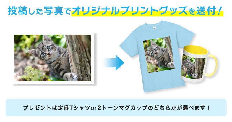 投稿いただいたお写真を、定番Tシャツ or 2トーンマグカップどちらかお好きなアイテムにプリントできます。詳細は下部 "受賞商品の詳細について" をご確認ください。