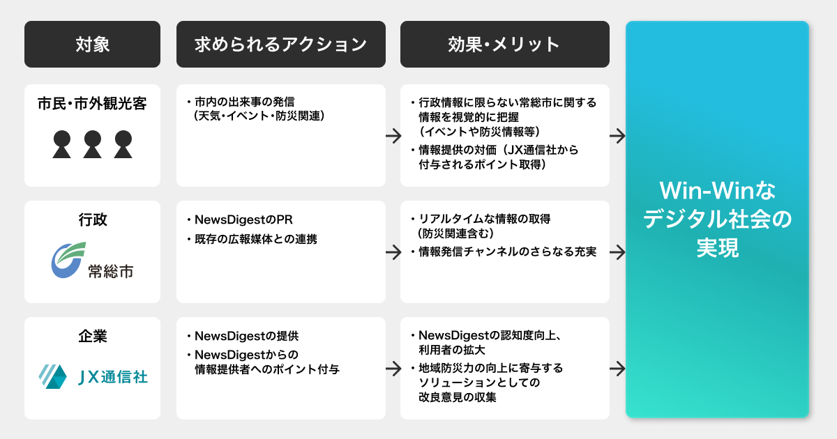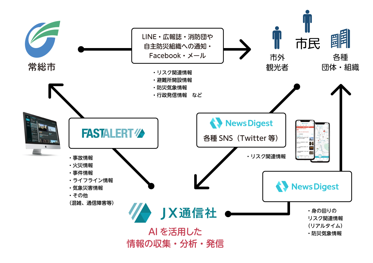 近年では、毎年のように全国各地で自然災害が頻発・激甚化しており大きな被害をもたらしています。なかでも、洪水や土砂災害を引き起こす大雨や短時間強雨の発生頻度は年々増加傾向にあり、的確な初動対応であらゆる被害を最小限に抑えるためにも、災害時においては網羅的かつ即時に地域の状況を把握したうえで、適切な情報発信により市民に安全安心な行動を促すことが行政には求められています。地域一体となった防災力の向上には、上記のような行政による「公助」の取組に加えて、自分の身は自分で守る「自助」や、近所の人と助け合う「共助」による 取組を並行して進めることが重要です。そこで、地域同士、地域と行政とが協力しあって網羅的 かつ即時に状況把握ができ、情報発信手段の多重化にもなりうる「NewsDigest」を、常総市での 地域防災力向上のための1つのソリューションとして利用推進していくとともに、更なる市民生活の安全安心の確保や、利便性の向上に対応していくための共同検討を実施していく運びとなりました。