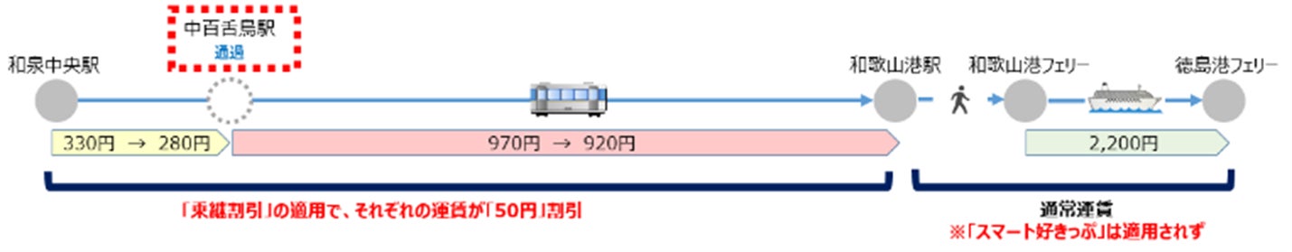 〇割引額 : 南海電鉄・泉北高速鉄道ともに各運賃から50円ずつを割引(合計100円割引)