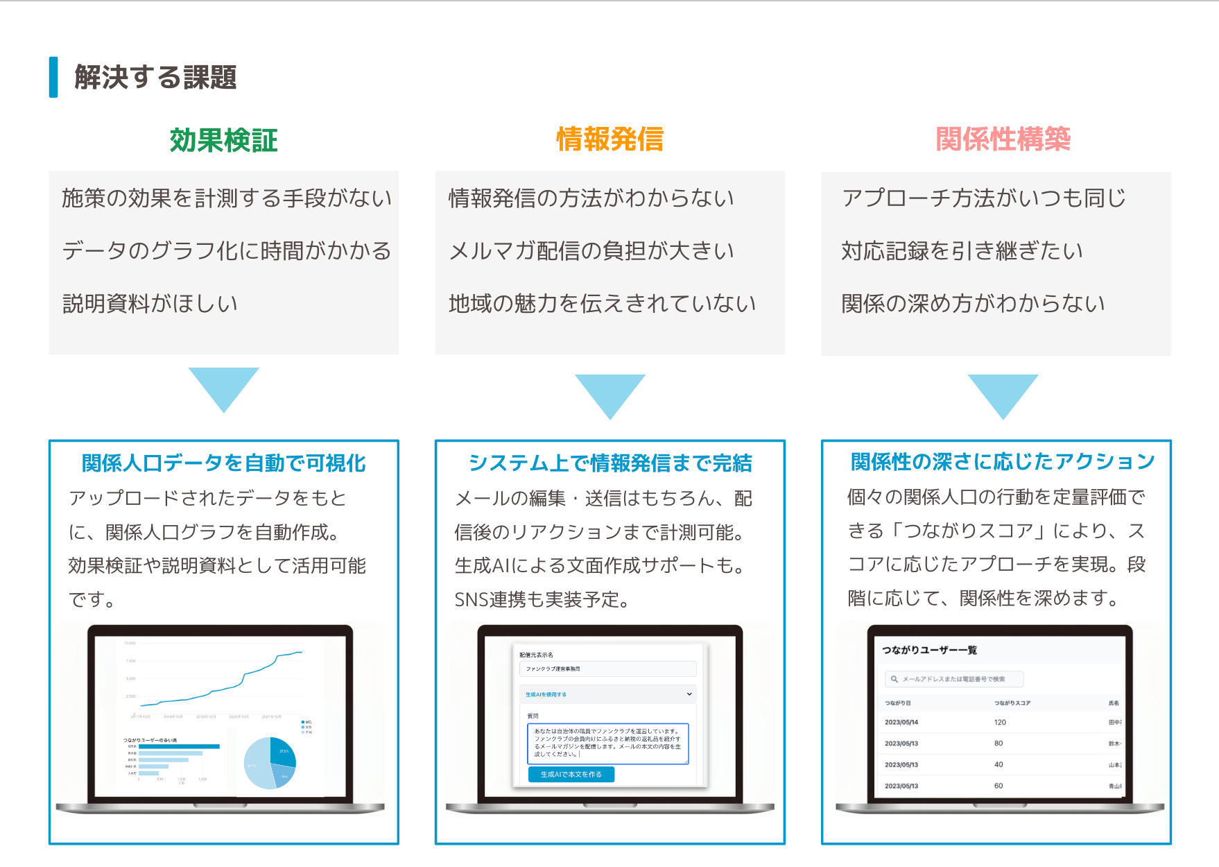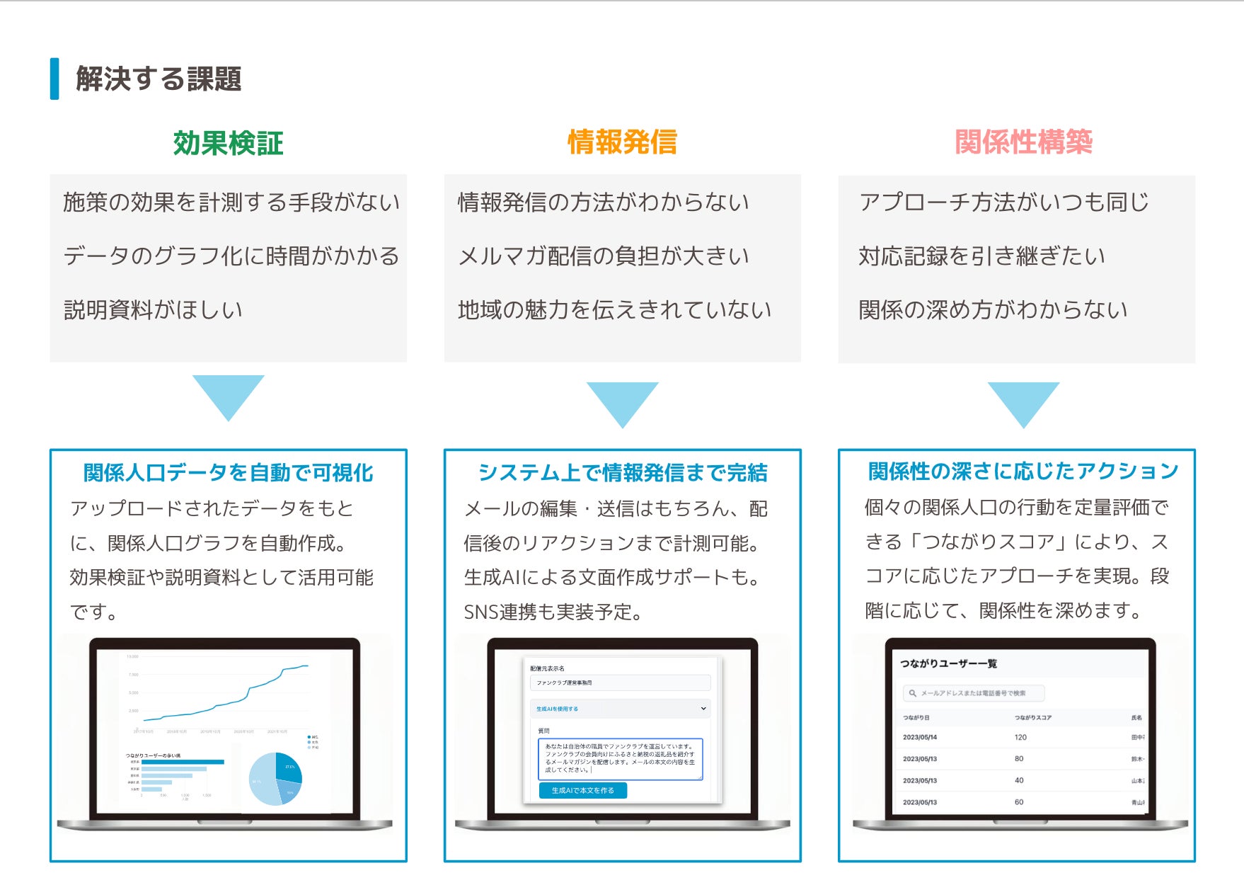 そういったなか、「つながるDX」は、地域に関わる人々との関係性を育み、未来につなげるオールインワンシステムを提供しています。地域ファンクラブ会員、イベント参加者、移住問い合わせ者、ふるさと納税寄付者など、多様な形で地域と接点をもつ人々のデータを一元管理。施策横断でのつながり深度を把握できるほか、つながり深度に応じてメール配信ができます。不明瞭になりがちなデータ(人数や行動属性、関係の深さ)をデジタルで見える化・一元管理し、効果最大化と効果検証の簡易化、業務効率化を提供しています。