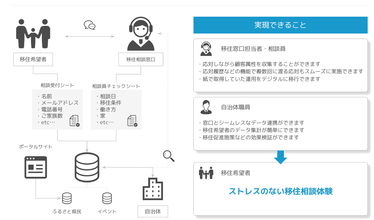 移住相談窓口に訪れた移住相談者の情報を管理するヒアリングシートをつながるDX上でデータ管理できるように。これによりこれまで相談後に手入力でシステムに移行していたフローを効率化し、分析にもすぐにデータが反映可能になります。
