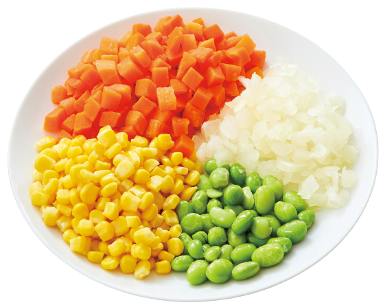 ミックスベジタブルは全てを国産の産直原料で賄えるよう、コーン、人参、玉ねぎに加え、子どもが好む枝豆を緑の彩りに採用しました。玉ねぎも入っているので加熱により甘みが出て、料理に味わいが増します。4種の野菜を冷凍のまま手軽に調理でき、スープやチャーハンなど多様な料理に彩りを加えられます。