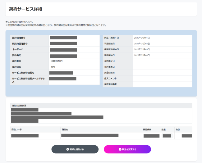 契約期間や更新日、提供サービスの価格変更に伴う期間設定など、契約情報をマイページおよびバックオフィス上で管理・表示できるようになりました。
