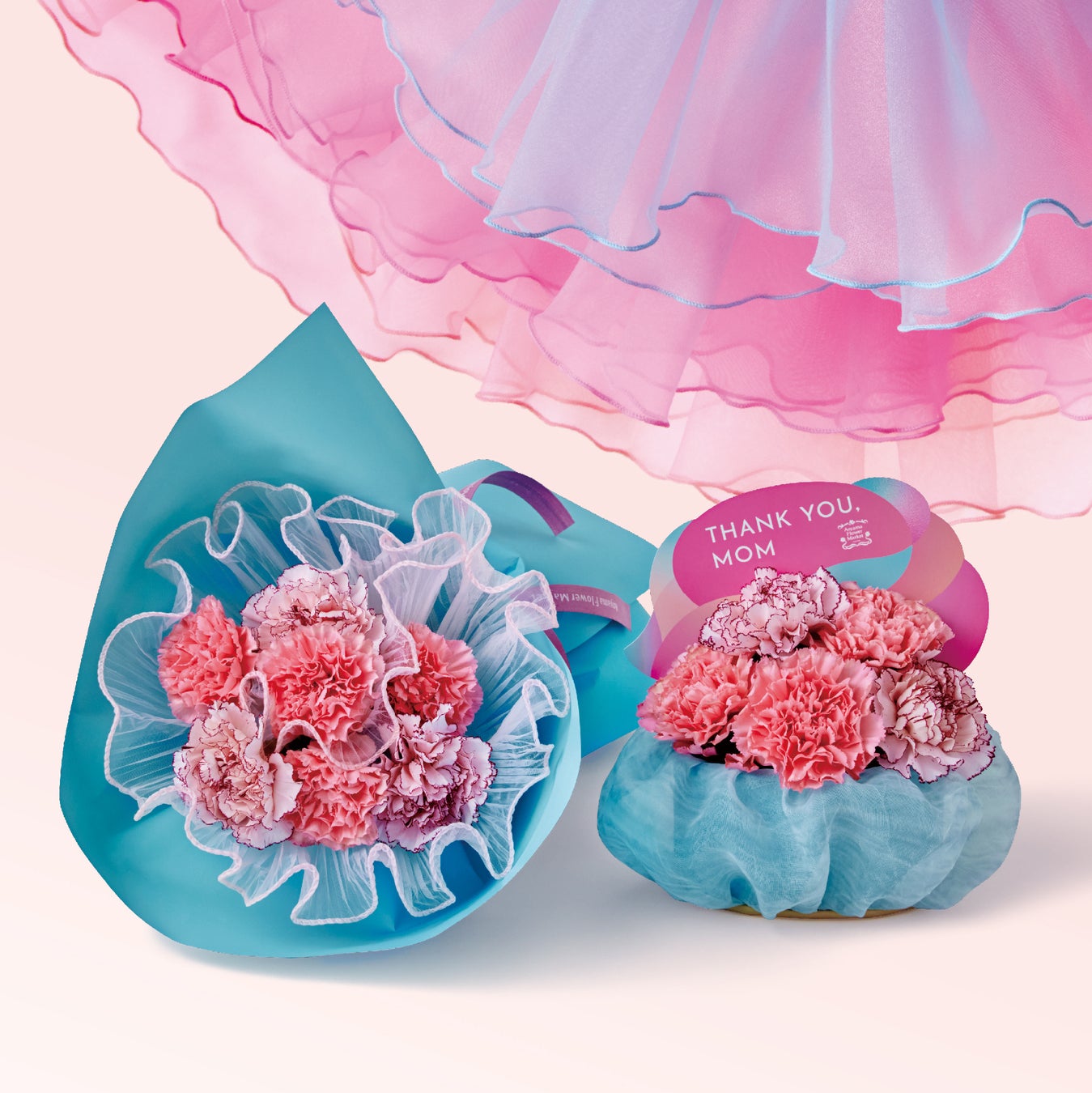 エアリーで繊細なシフォンを贅沢に纏ったアレンジメントギフト。空気を含んでいるような軽やかな素材の器が、カーネーションの美しさを優しく引き立てます。そのまま置くだけでパッと目を引く華やかさが魅力です。