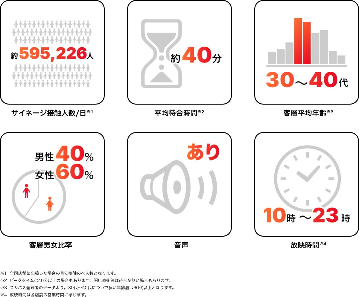 今回、全国約640店舗におよぶ「スシロー」の店内に設置されたデジタルサイネージ(※レジ待ち・待合室・通路エリアなど)に、広告主の動画・静止画コンテンツを配信することで、店舗内での自然なブランド接触と購買意欲の向上を狙ったプロモーションが可能になります。