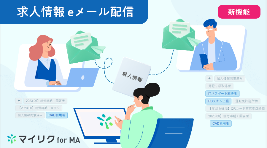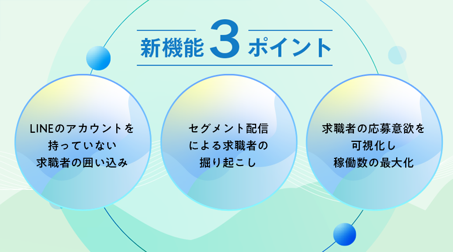 今まではLINEのアカウントを持っている求職者にのみ、求人情報の配信が可能でした。新機能によりLINEのアカウントを持たない求職者に対しても、eメールを通じて求人情報の配信ができるようになり、求職者のさらなる囲い込みと最大化を実現します。