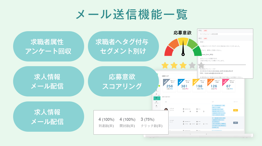 LINEと同様、eメールで配信した求人情報に対するクリックの有無や閲覧時間などを求職者毎に計測し応募意欲の高まりをスコアリング。就業意欲の高い求職者に対して効率的にアプローチでき、稼働数の増加をサポートします。