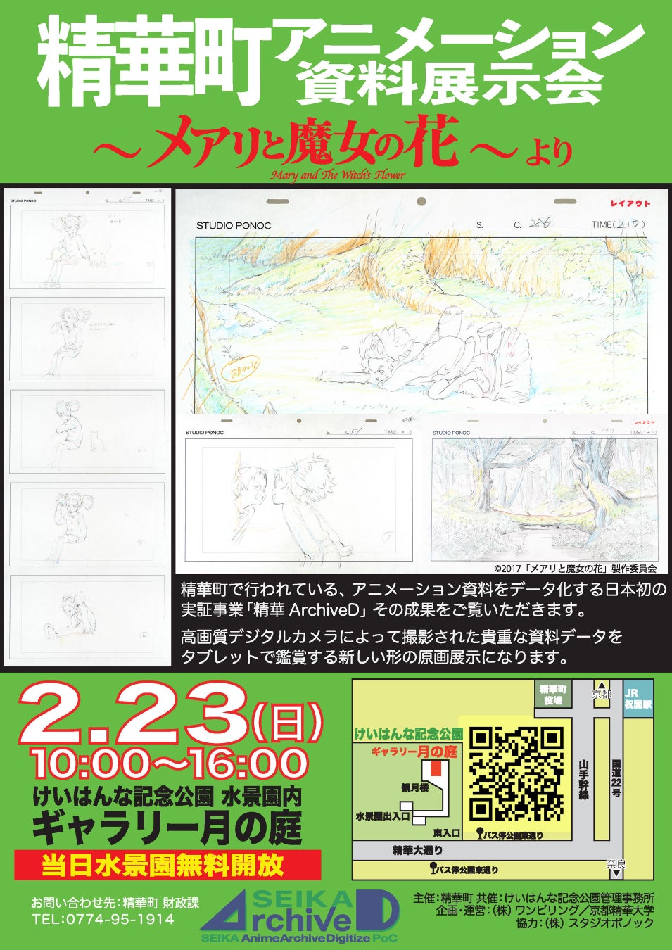 本事業に参加している株式会社スタジオポノックより借り受けたアニメーション作品「メアリと魔女の花」の中間成果物から作成したデジタルデータを用いて、タブレット端末による資料展示を、けいはんな記念公園水景園内ギャラリー「月の庭」で開催します。このような形式でのアニメーション資料展示は国内では初の試みとなります。