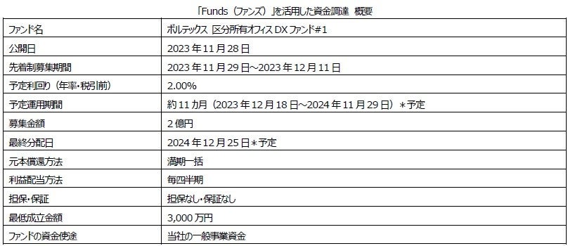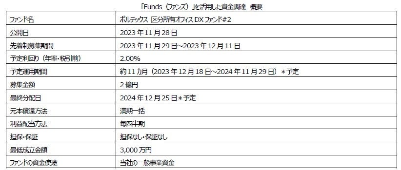 「区分所有オフィス®」を主軸に資産形成コンサルティングを行う株式会社ボルテックス(東京都千代田区 代表取締役社長 兼 CEO 宮沢 文彦、以下当社)は、ファンズ株式会社(本社:東京都渋谷区 代表取締役 藤田雄一郎、以下ファンズ)が運営する手数料無料で1円から貸付投資ができる貸付ファンドのオンラインマーケット「Funds(ファンズ)」を通じて、当社の一般事業資金を調達しました。本年の夏に実施した第1弾に引き続き2億円を受け付けましたが、募集開始より早期に満額到達となりました。