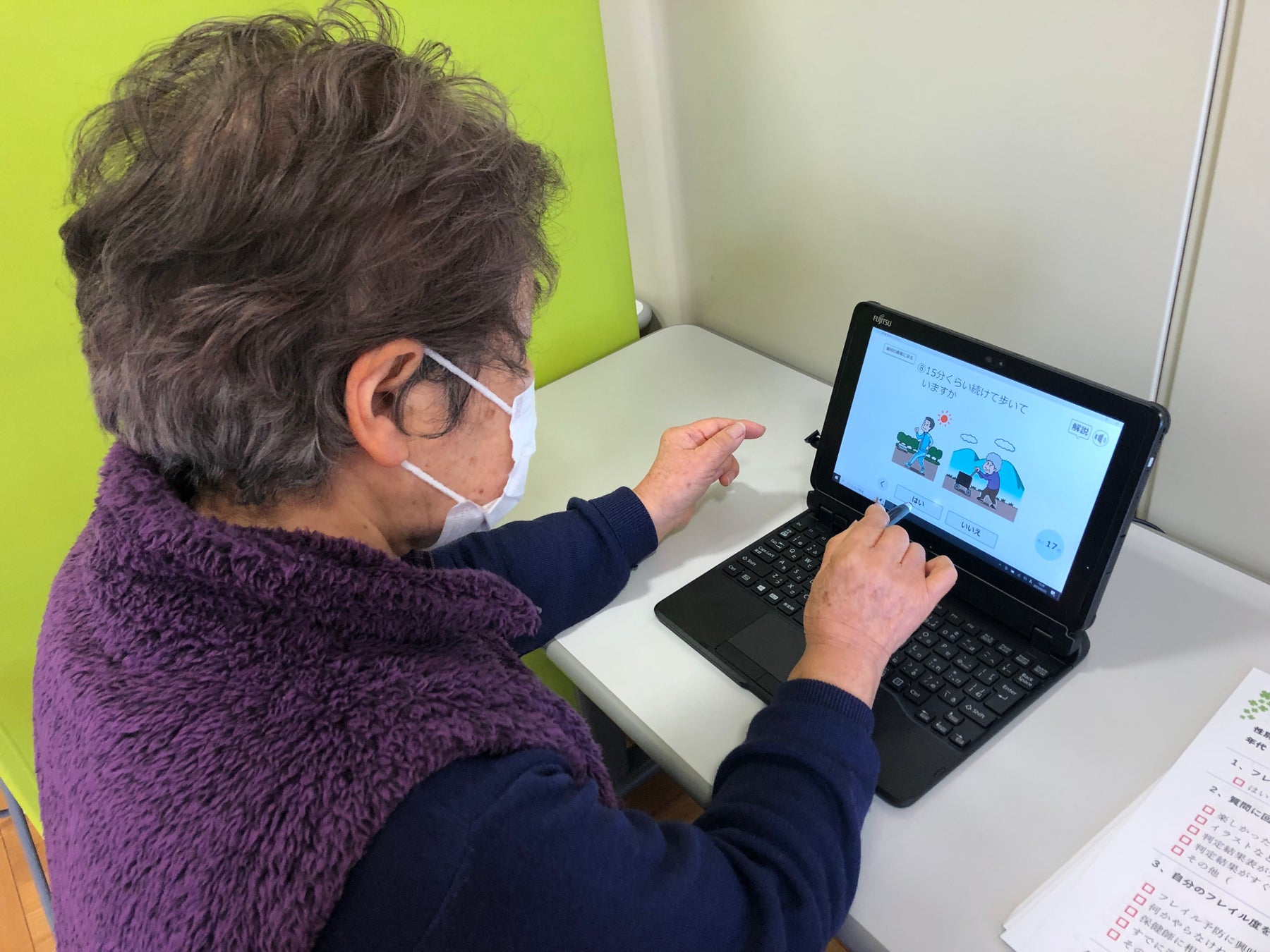 シルバーリハビリ体操や音楽療法等の通常プログラムの合間に、会場後方に開設した「ASTERⅡ」啓発版ブースにお越しいただき、タブレットに表示される25問の質問をタッチして回答いただきます。結果表は、その場で印刷してご本人に渡します。