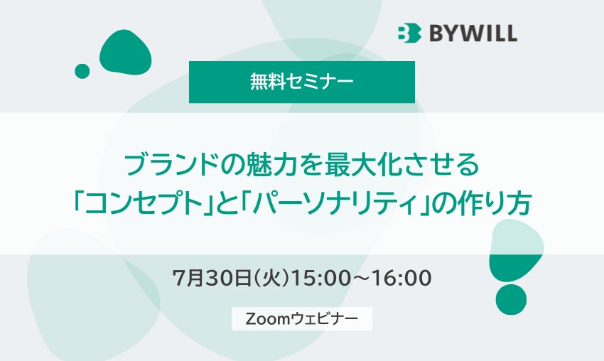 企業のブランドコンサルティングや脱炭素コンサルティングを行う株式会社バイウィルは、無料セミナー『ブランドの魅力を最大化させる「コンセプト」と「パーソナリティ」の作り方』を2024年7月30日(火)15:00よりオンラインにて開催します。