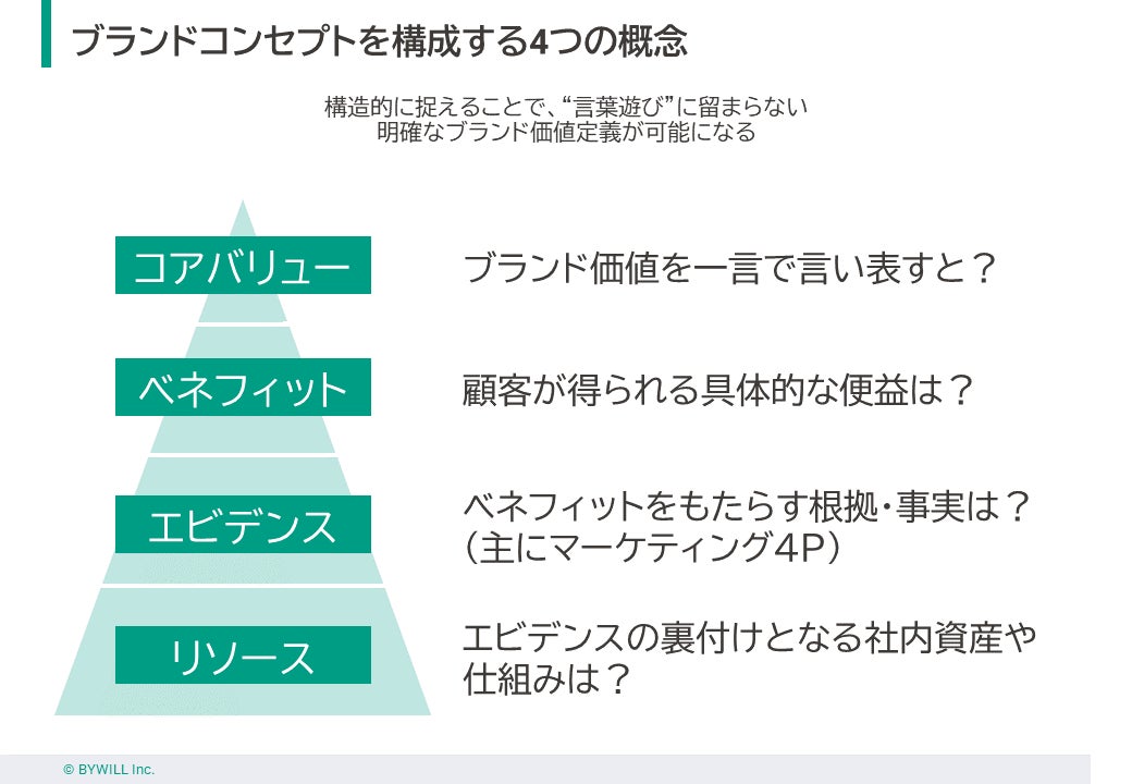 そしてこのような状態に陥ることを防ぐには、「ブランドコンセプトを構造的に構築・整理すること」「ブランドパーソナリティを規定すること(ブランドを人に例えたキーワードで明文化すること)」が有効です。