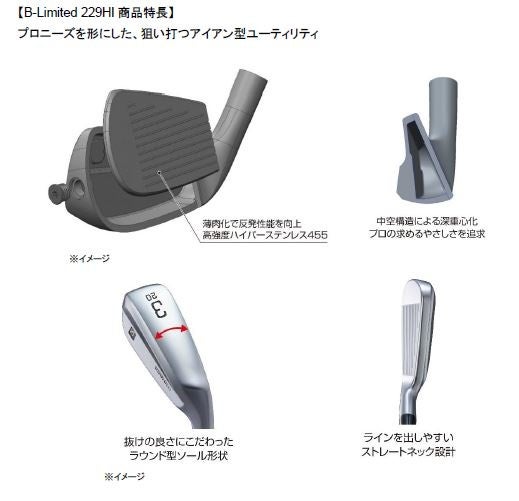 『B-Limited 229HI』は、 中空構造による深重心化に加え 、抜けの良いラウンド 型 ソール 、ラインを出しやすいストレートネック設計で、ロングレンジで 狙えるやさしさを追求 したアイアン型ユーティリティです。