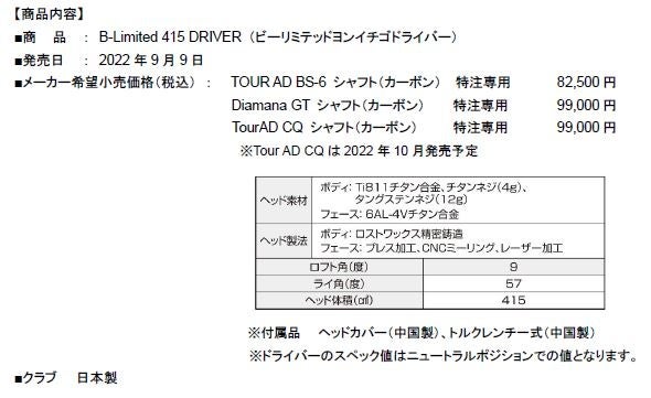 メーカー希望小売価格※2は、『 B-Limited 415』が 82,500円( 特注専用、税抜価格 75,000円、TOUR AD BS-6 シャフト)、『 B-Limited 229HI』は 30,800円 特注専用、 税抜価格 28,000円 N.S.PRO MODUS3 TOUR120/105、Dynamic Goldシャフト 、 『 B-Limited 220MB』が 1本 24,200円( 特注専用、税抜価格 22,000円、 N.S.PRO MODUS3 TOUR120、Dynamic Goldシャフト)、にて 発売します。