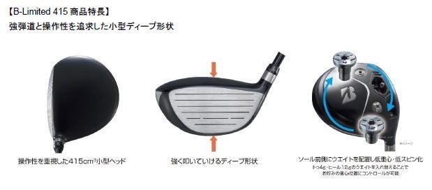『B-Limited 415』は、操作性を重視した 415cm3小型ヘッドに 、 フェースの反発力をコントロールする SP-COR(サス ペンションコア)やパワーミーリングなどの最新テクノロジーを搭載。 強く叩いていけるディープ形状で、低スピンで強弾道な飛びと 操作性を追求しています 。