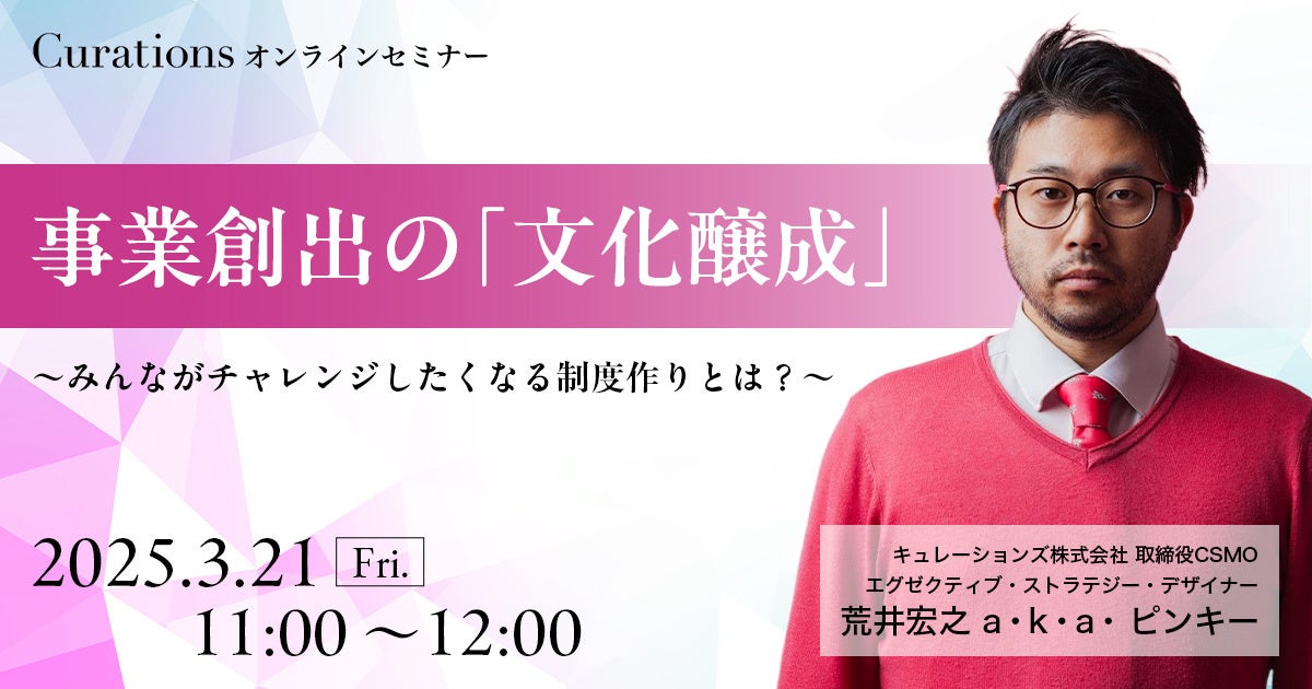 顧客企業のビジネス変革を成功に導くキュレーションズ株式会社(本社:東京都渋谷区、代表取締役社長:根本隆之、以下当社)は、『事業創出の「文化醸成」〜みんながチャレンジしたくなる制度作りとは?〜』を2025年3月21日(金)に開催いたします