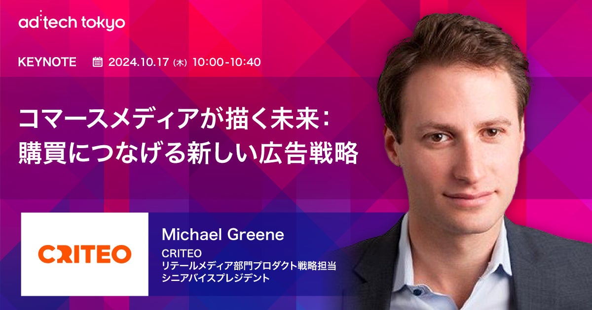 マーケティングの国際カンファレンスを多数企画・実施しているComexposium Japan (コムエクスポジアム・ジャパン) 株式会社(東京都港区、代表取締役社長:古市優子)は、2024年10月16日(水)~18日(金)に東京ミッドタウン&ザ・リッツ・カールトン東京で行われる「ad:tech tokyo (アドテック東京) 」の基調講演 (キーノート) に、フランスに本社を置くコマースマーケティングのグローバルテクノロジー企業、CRITEO (クリテオ) のリテールメディア部門プロダクト戦略担当 シニアバイスプレジデント Michael Greene (マイケル・グリーニー) 氏の登壇が決定したことを発表します。