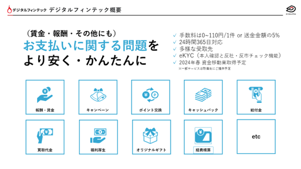 「デジタルウォレット」は、各種ポイントサービスや動画配信など、さまざまなサービスで貯めたポイントや報酬を、R(リアル)としてまとめ、現金や、お得なギフト券等で受け取ることができるサービスです。資金移動業取得後は、デジタル給与払い、個人間送金等、提供範囲が拡大される予定です。