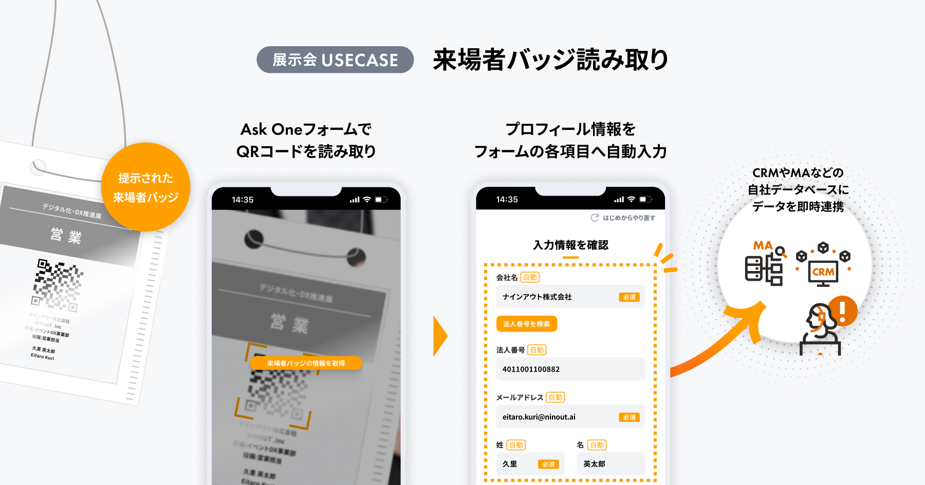 これにより、Ask One を利用する出展企業は、QRコードに登録された来場者情報をその場で参照しながらブース対応を行えるようになります。来場者情報は名刺やヒアリングした内容とともにCRM・MAなどの外部サービスに即時連携され、展示会当日の対応から事後フォローまで一貫した情報連携が可能になります。