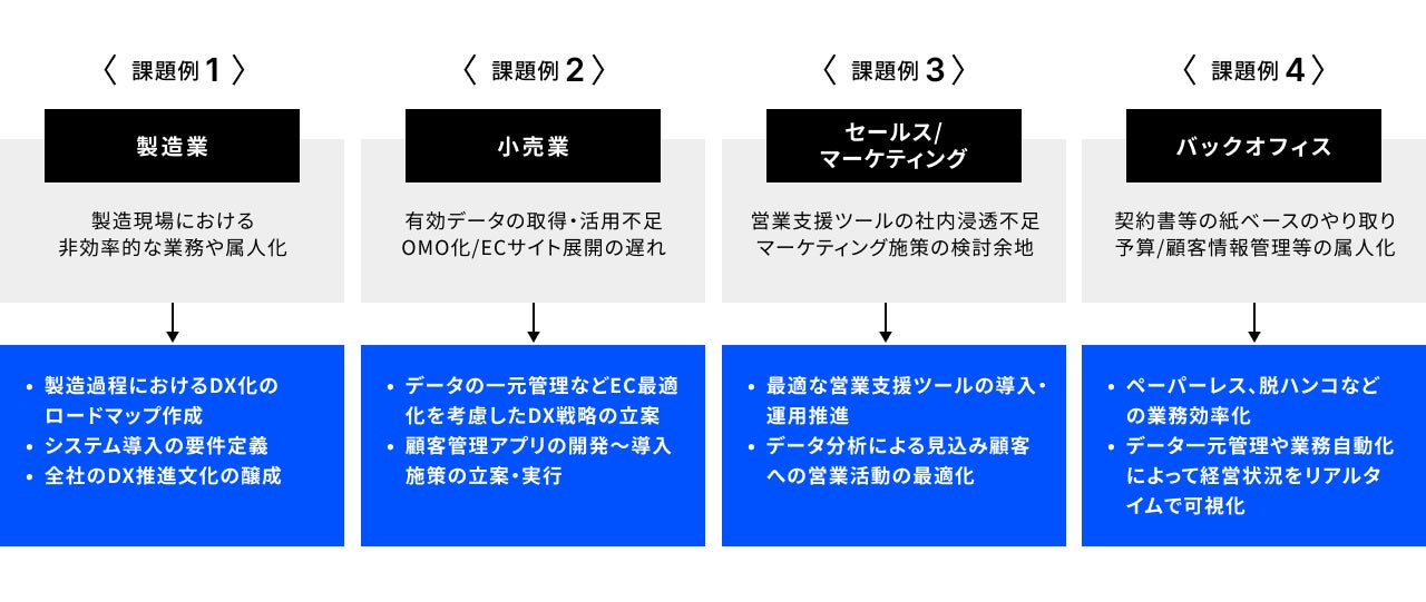 製造、小売、営業、バックオフィスなどのあらゆる業界・職種において、DX戦略の立案、DX支援ツールの導入検討から実際の運用、データ管理・活用など様々な場面でご活用いただけます。属人化した業務をデジタル化したり、ITツールの社内への浸透を図ることで、業務の効率化にも直結する大変有効なプランです。