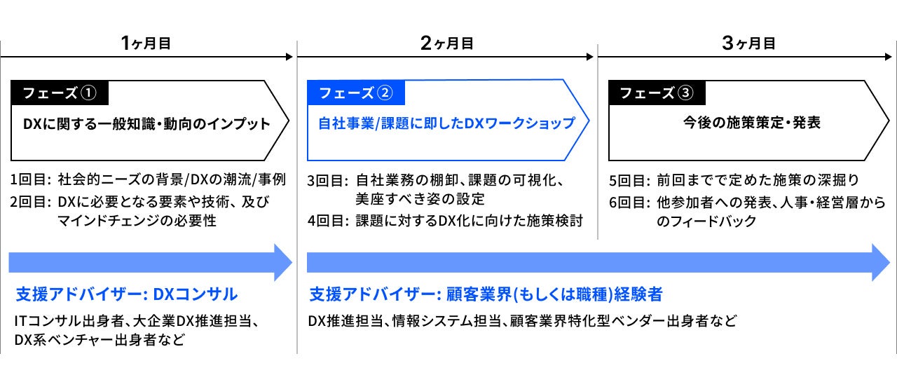 2〜3ヶ月目:顧客の業界/職種の経験を持つアドバイザーが学びを提供します。ワークショップを通じて、自社業務の棚卸し、課題の洗い出し、DX化に向けた施策検討まで一気通貫で支援します。