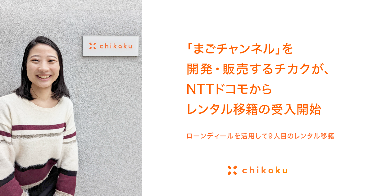スマートフォンアプリで撮影した動画や写真を実家のテレビに直接送信できる「まごチャンネル」を開発・販売している株式会社チカク(東京都渋谷区、代表取締役・梶原健司、以下「チカク」)は、株式会社ローンディール(東京都港区、代表取締役社長:原田未来、以下「 ローンディール」)が提供する企業間レンタル移籍プラットフォーム「LoanDEAL」を通し、株式会社NTTドコモ(東京都千代田区、代表取締役社長:井伊基之、以下「ドコモ」)から新サービス企画担当として人材のレンタル移籍(1年間)を開始いたしました。チカクのレンタル移籍者受け入れは9人目となります。