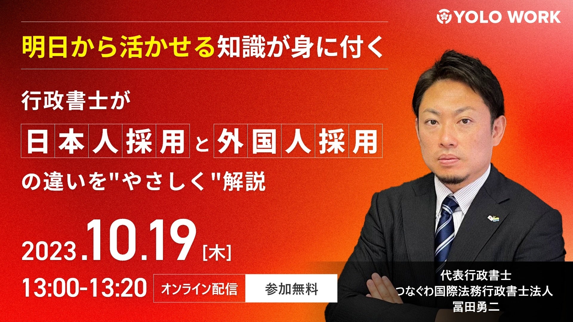 在留外国人が見つかる求人情報サイト「YOLO WORK」を運営する株式会社YOLO JAPANでは、無料オンラインセミナー「【明日から活かせる知識が身に付く】行政書士が日本人採用と外国人採用の違いを”やさしく”解説」を、2023年10月19日(木)に開催します。
