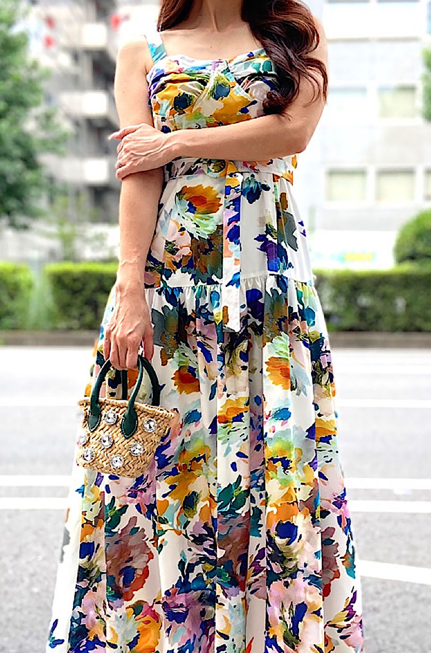コルセット風な胸元がセクシーなサマードレス。ペイント風のフラワープリントが鮮やかで、華やかな印象のワンピースです。