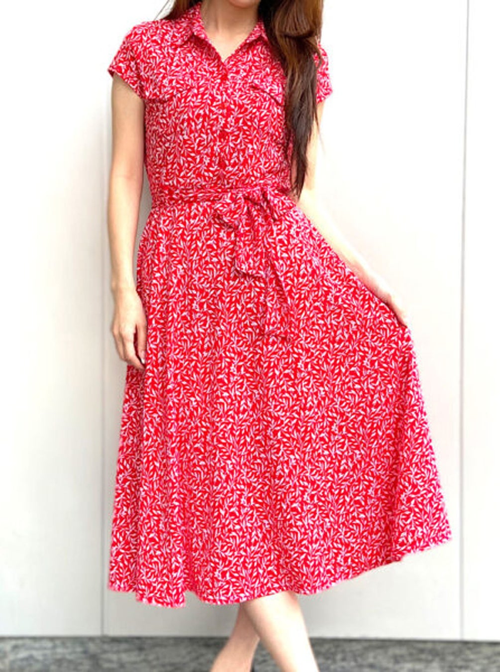 人気のフランス発のストレッチワンピース。夏らしいビビットなカラーであるものの、細かなリーフプリントにより可愛い印象。細見え効果も期待できる美しいライン。フランスのストレッチワンピースは、ライン・着心地ともに人気のアイテムです。