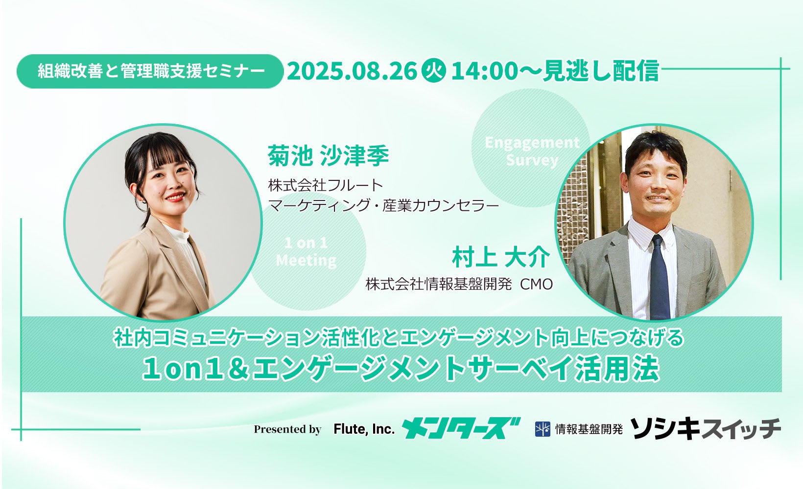 弊社・株式会社情報基盤開発は2025年8月26日(火)、社外メンターによる伴走型の1on1支援サービス「メンターズ」を提供する株式会社フルートとの共催で7月に開催した「社内コミュニケーション活性化とエンゲージメント向上」をテーマにしたオンラインセミナーの見逃し配信を行います。
