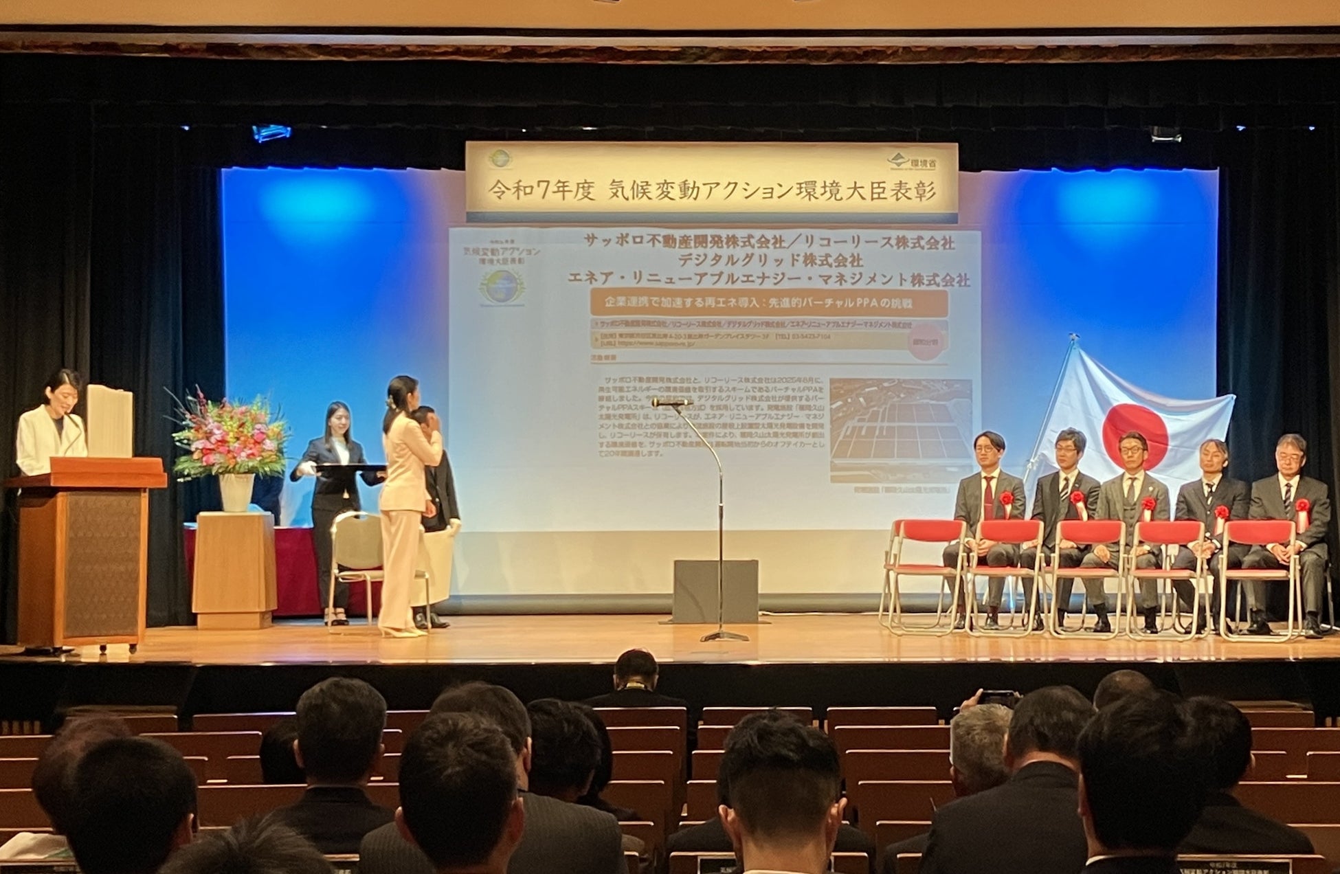 サッポロ不動産開発株式会社(本社:東京都渋谷区、代表取締役社長:宮澤 高就、以下「当社」)は、リコーリース株式会社※1(以下「リコーリース」)、デジタルグリッド株式会社※2、エネア・リニューアブルエナジー・マネジメント株式会社※3とともに、再生可能エネルギー(以下、再エネ)の環境価値を取引するスキームであるバーチャルPPA(Power Purchase Agreement)※4が評価され、「令和7年度 気候変動アクション環境大臣表彰」を共同受賞しました。今回の受賞は、当社が取り組む先進的なバーチャルPPAの挑戦が高く評価されたものです。
