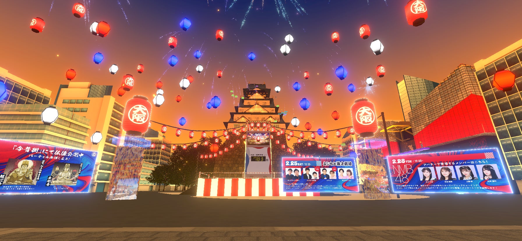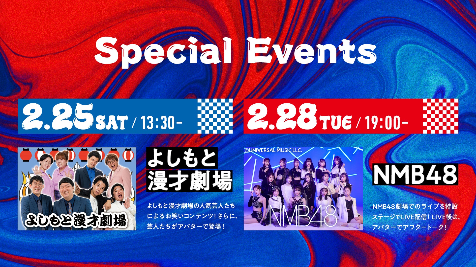 2月25日(土)は、よしもと漫才劇場とコラボレーションし、人気お笑い芸人が登場するお笑いコンテンツを実施予定。さらに2月28日(火)は、NMB48とコラボレーションし、ライブパフォーマンスのパブリックビューイングを予定しています。コンテンツ・ライブ終了後には、お笑い芸人やNMB48メンバーが、アバターとなってバーチャル大阪に登場し、アフタートークなどで盛り上げます。