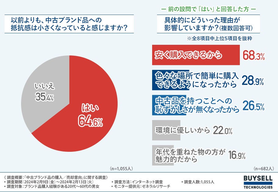「はい(64.6%)」と回答した人に、「具体的にどういった理由が影響していますか?(複数回答可)」と質問したところ、「安く購入できるから(68.3%)」が最も多く、次いで「色々な場所で簡単に購入できるようになったから(28.9%)」「中古品を持つことへの恥ずかしさが無くなったから(26.5%)」と続きました。