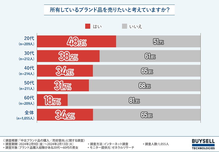 「所有しているブランド品を売りたいと考えていますか?」と質問したところ、「はい」と回答したのは「20代(48.3%)」が最も多く、年齢が若いほど売却意向が高い傾向が見られました。