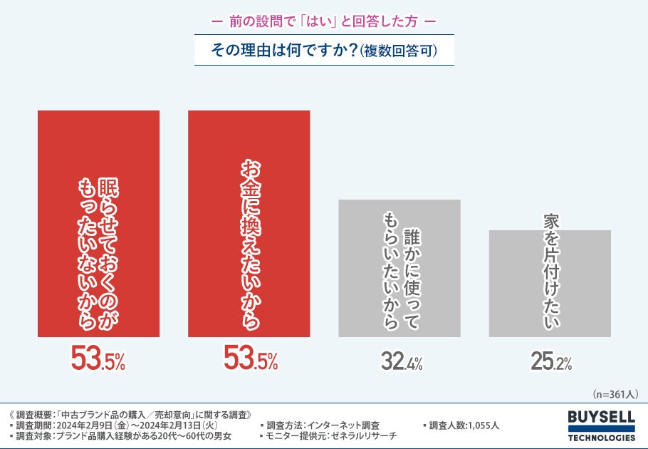 「はい(34.2%)」と回答した人に、「その理由は何ですか?(複数回答可)」と質問したところ、「眠らせておくのがもったいないから(53.3%)」と「お金に換えたいから(53.5%)」が最も多く、次いで「誰かに使ってもらいたいから(32.4%)」「家を片付けたい(25.2%)」と続きました。