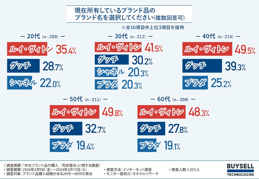 「現在所有しているブランド品のブランド名を選択してください(複数回答可)」と質問したところ、好きなブランドと同様に全ての年代で「ルイ・ヴィトン」が1位となりました。
