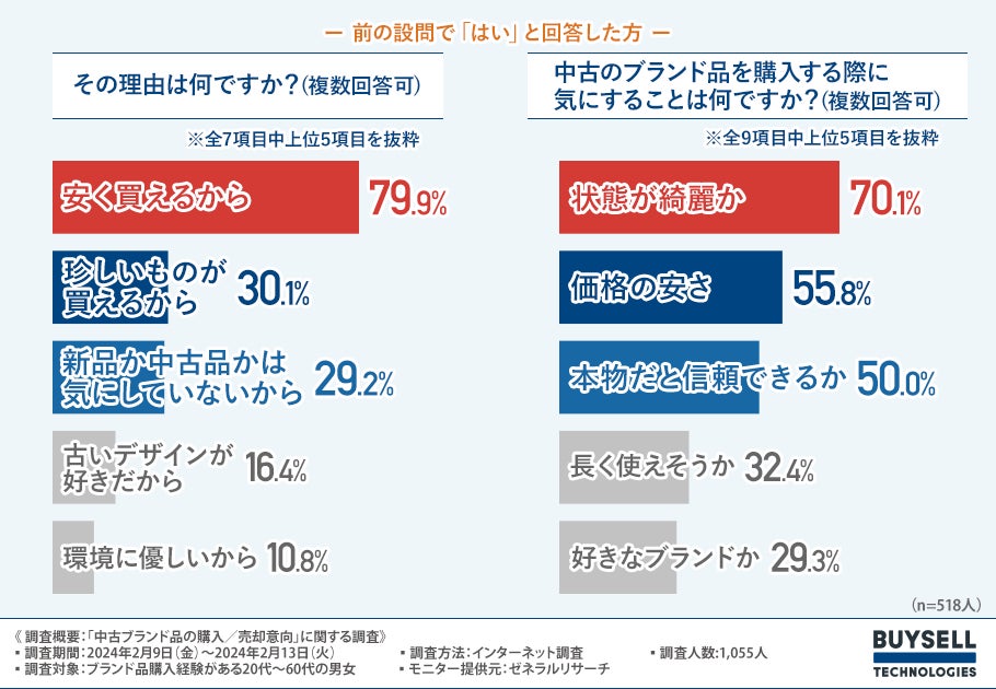 ・中古ブランド品を購入したい理由は「安く買えるから(79.9%)」が最多。