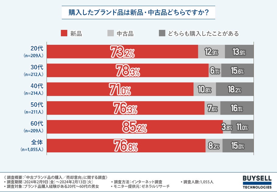 「購入したブランド品は新品・中古品どちらですか?」と質問したところ、全体では「新品(76.8%)」「中古(8.2%)」「どちらも購入したことがある(15.0%)」という回答結果になりました。